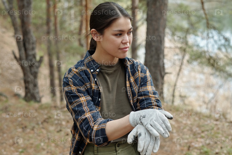 Молодая женщина стоит на улице, корректируя рабочие перчатки в лесу
