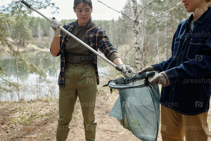 Молодая взрослая азиатская женщина собирает мусор на открытом воздухе с молодым мужчиной