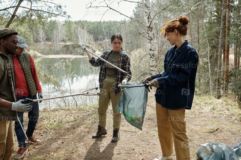 Мультиэтнические молодые взрослые собирают мусор возле лесного озера во время уборки