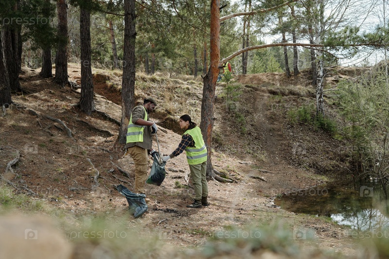 Молодой взрослый мужчина и женщина собирают мусор в лесу возле воды