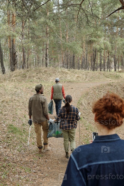 Группа разнообразных молодых взрослых, собирающих мусор во время прогулки по лесу