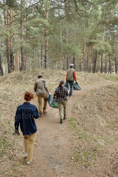 Группа молодых взрослых многоэтнических друзей, собирающих мусор в лесной тропе