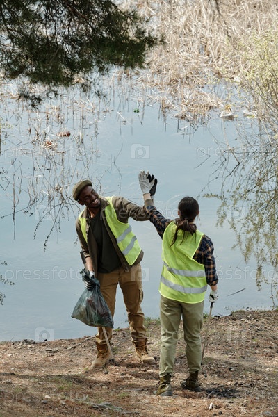 Мужчина и женщина получают высокую пятёрку во время волонтерской работы