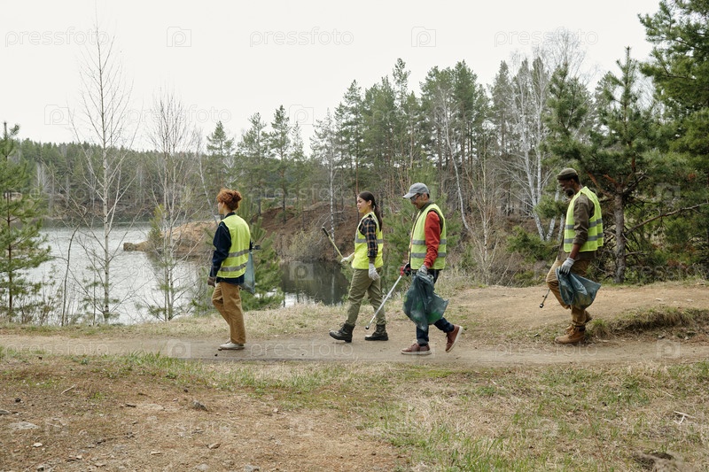 Мультиэтнические молодые взрослые собирают мусор, гуляя вдоль лесного озера