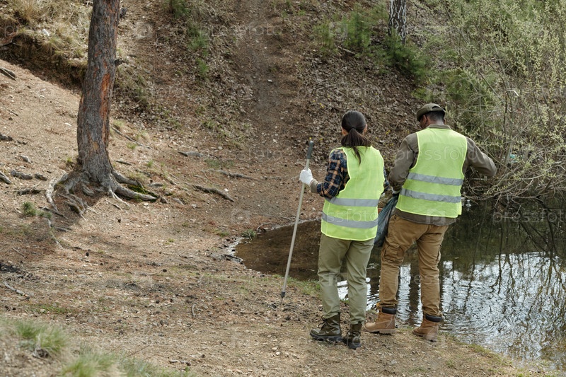 Молодая взрослая женщина и чернокожий мужчина собирают мусор возле лесного пруда