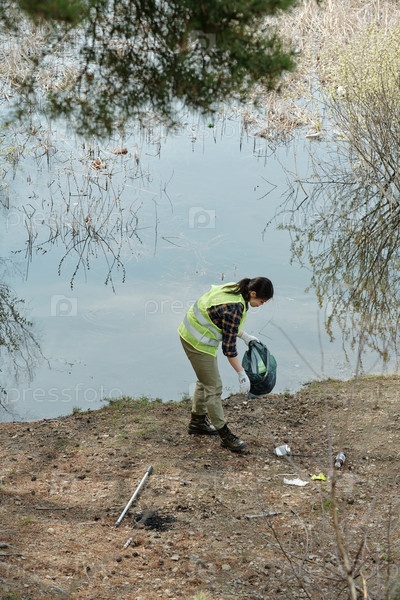Молодая взрослая азиатская женщина собирает мусор возле озера во время экологической очистки