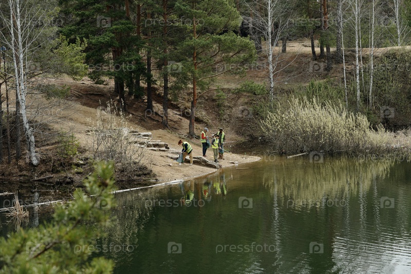 Группа молодых взрослых мужчин, собирающих образцы воды вблизи лесного озера