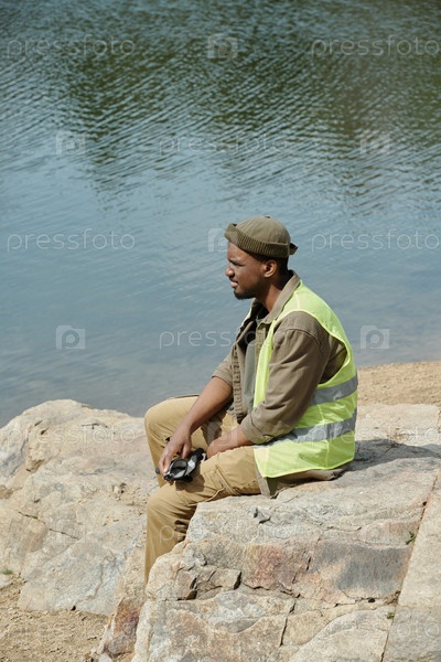 Молодой взрослый чернокожий мужчина сидит на скале, отражая воду в открытом воздухе