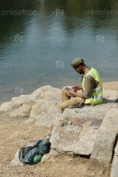 Молодой взрослый чернокожий мужчина сидит на улице, используя планшет рядом с водой