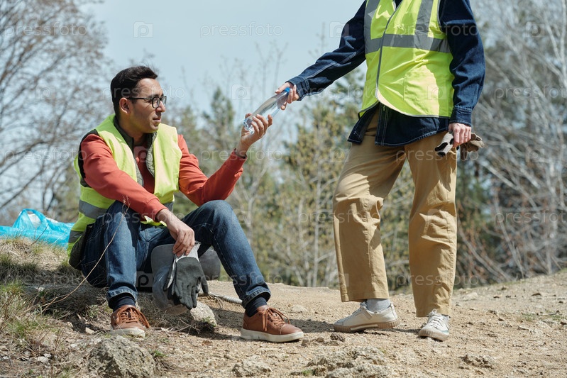 Молодой взрослый мужчина сидит на улице, получая бутылку с водой от коллеги