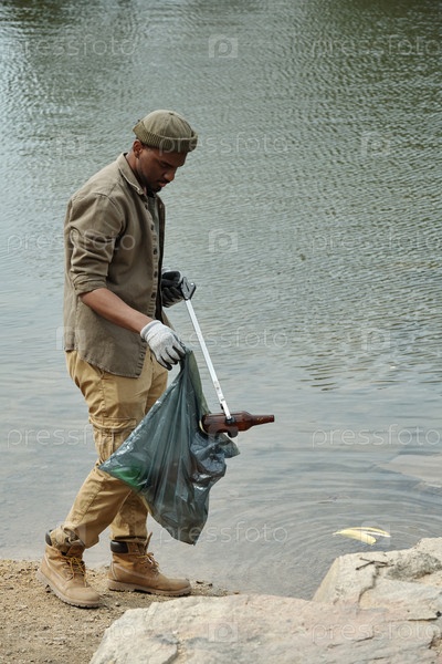 Молодой взрослый чернокожий мужчина собирает мусор у речного берега во время экологической очистки