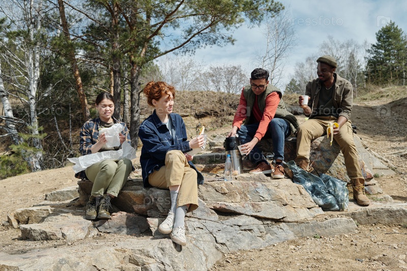 Разнообразные молодые взрослые сидят на улице, делясь едой и напитками во время пикника