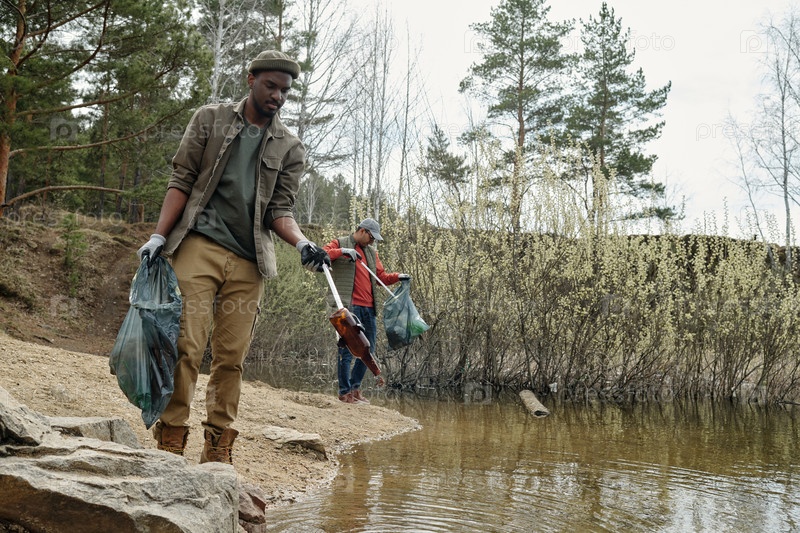 Молодой взрослый чернокожий мужчина собирает мусор у озера с многонациональным волонтером