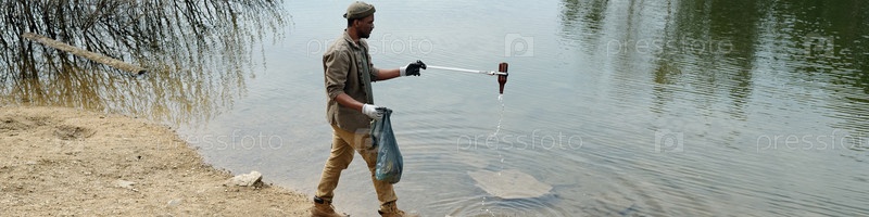 Молодой взрослый чернокожий мужчина собирает мусор с помощью Grabber Tool вдоль берега озера