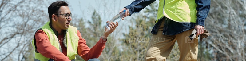 Молодой человек получает бутылку с водой от коллеги на открытом воздухе