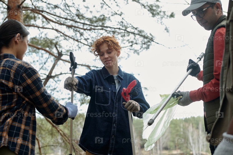 Молодая женщина и разные взрослые собирают мусор на открытом воздухе вместе