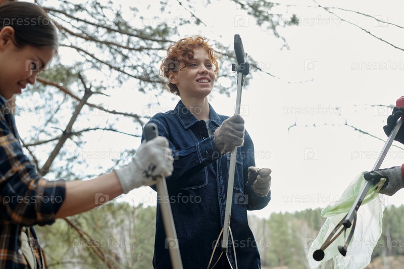Молодая женщина собирает мусор на открытом воздухе с многонациональной группой