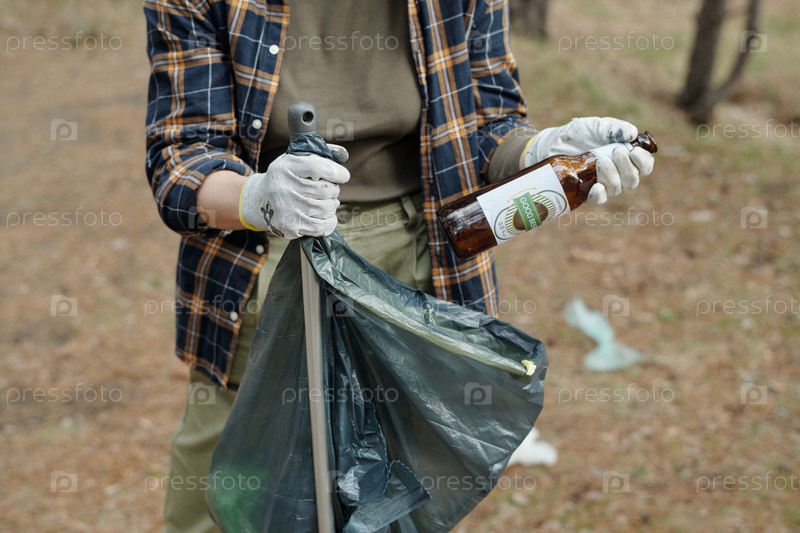 Молодой человек собирает мусор на открытом воздухе во время экологической очистки