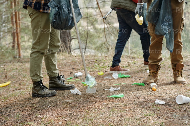 Группа молодых взрослых мужчин, собирающих мусор на открытом воздухе во время экологической очистки