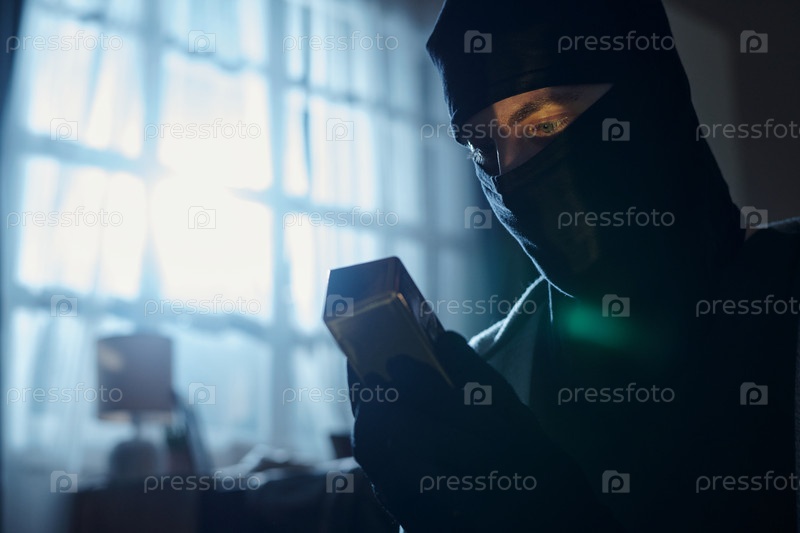Человек, носящий маску, осматривающий украденный предмет в помещении