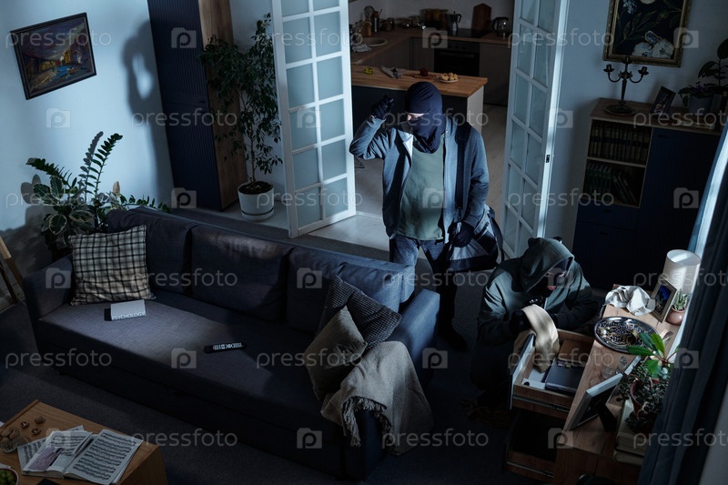 Два маскированных мужчины воруют ценные вещи во время ограбления дома ночью