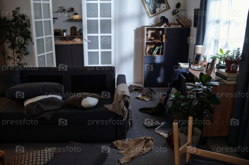 Беспорядочный интерьер гостиной, показывающий разбросанные книги и беспорядочную мебель