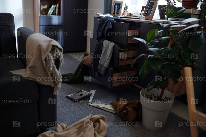 Беспорядочная гостиная, показывающая открытые ящики и разбросанные вещи после кражи