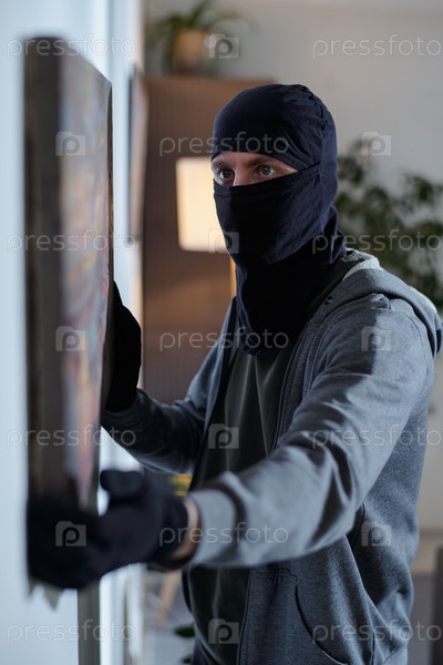 Вор, носящий маску, крадет картину со стены в помещении