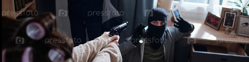 Женщина, столкнувшаяся с маскированным вором Сдается поднятой рукой