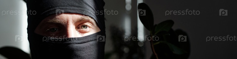 Портрет мужчины в черной маске, смотрящего на камеру