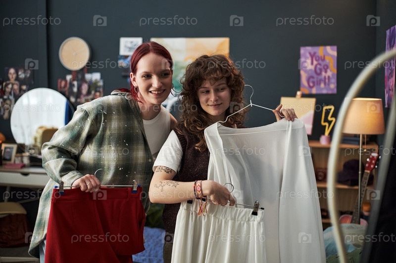 Gen Z Девочки-подростки улыбаются, выбирая одежду вместе дома