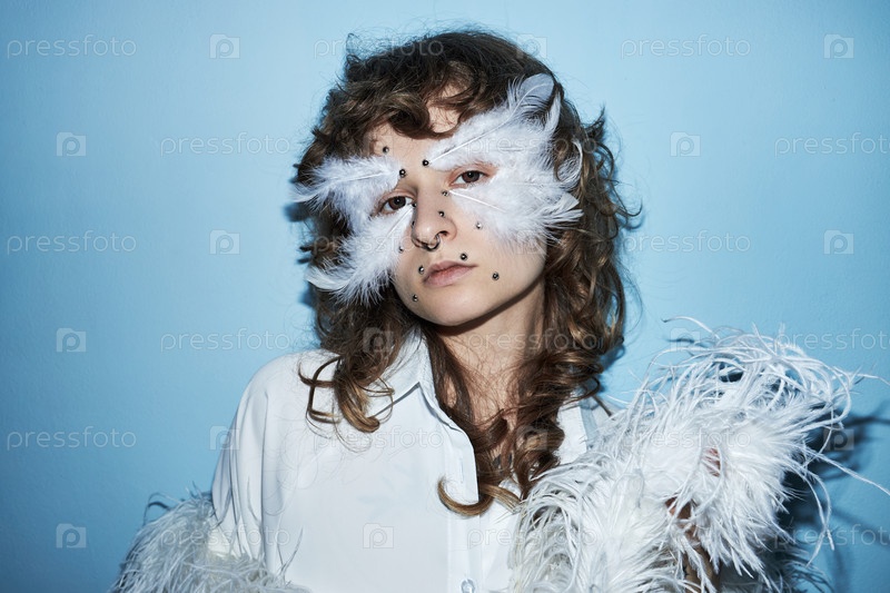 Портрет девочки-подростка, носящей маску из перьев и позирующей творчески