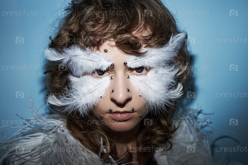 Портрет молодой взрослой женщины, носящей перьевые аксессуары дома