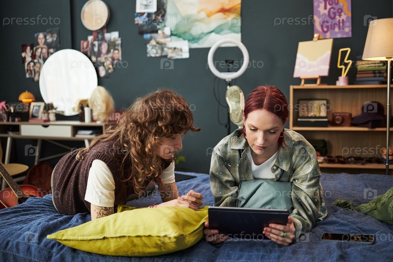 Две творческие девочки из поколения Z сотрудничают с помощью цифровых планшетов в помещении