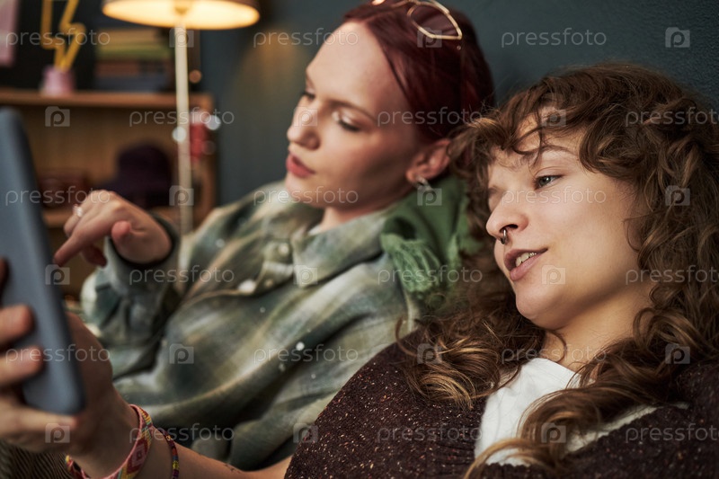 Женщины поколения Z отдыхают дома, используя цифровые планшеты вместе