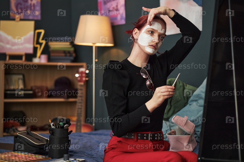 Gen Z Молодая женщина наносит маску для лица, отдыхая дома
