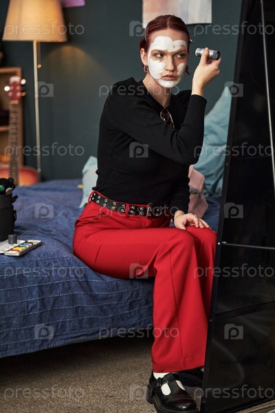 Девушка-подросток наносит креативную краску для лица, сидя в помещении