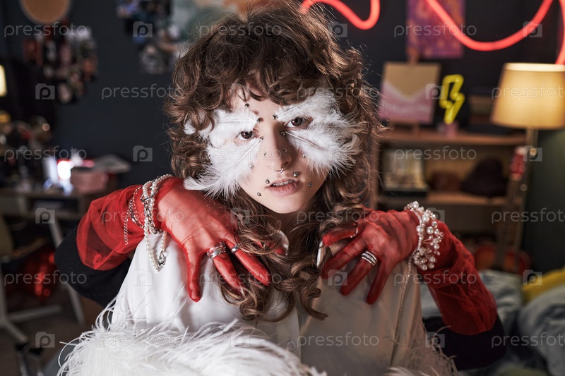 Портрет девочки-подростка, носящей креативный макияж и позирующей дома