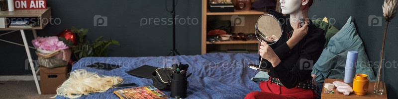 Девушка-подросток наносит макияж и стилизует парик в творческой спальне