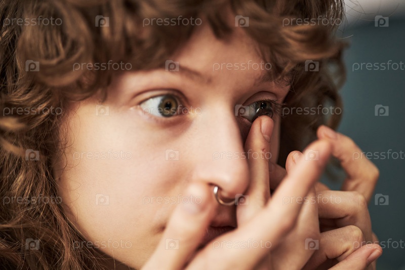 Девушка-подросток вставляет контактные линзы, сидя дома