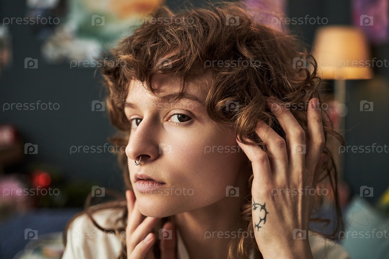 Портрет женщины поколения Z, прикасающейся к волосам дома в творческой обстановке
