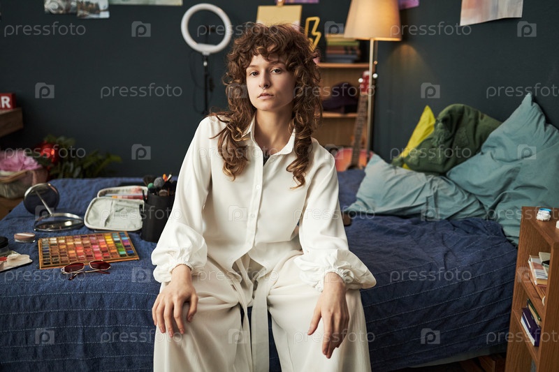 Портрет девочки-подростка, сидящей на кровати и создающей искусство дома
