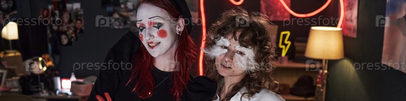 Девочки-подростки выражают творчество с помощью художественной краски лица дома