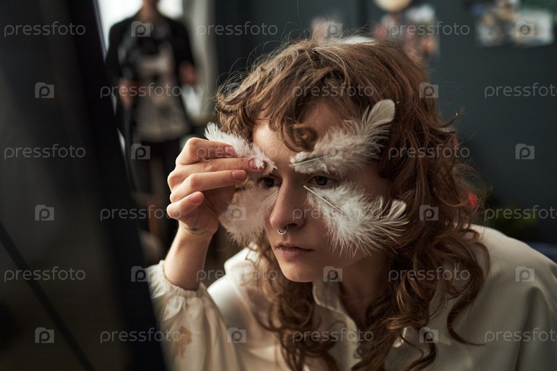 Девушка Z-генерации создает художественный макияж с перьями дома
