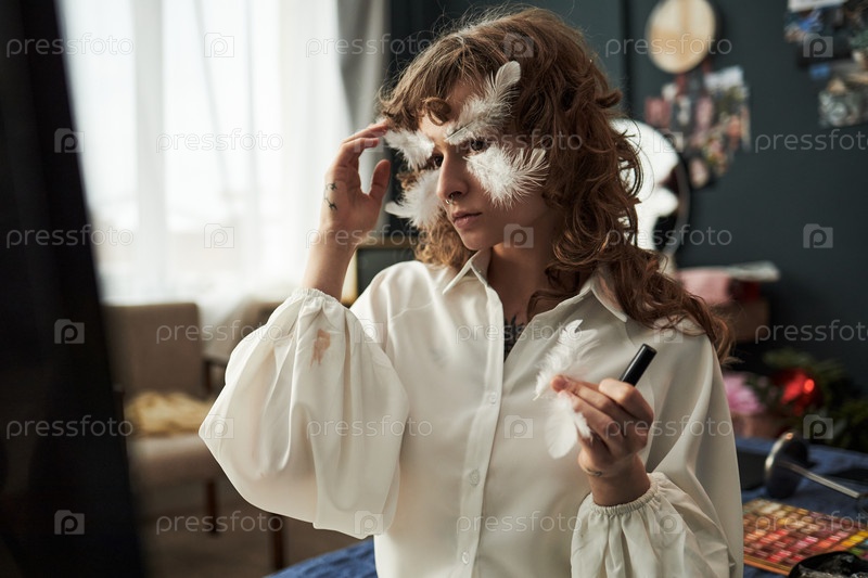 Девушка-подросток, создающая художественный макияж Look with Feathers at Home