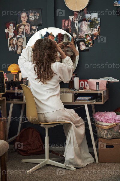 Девушка-подросток стилизует волосы на столе Ванни в креативной обстановке спальни