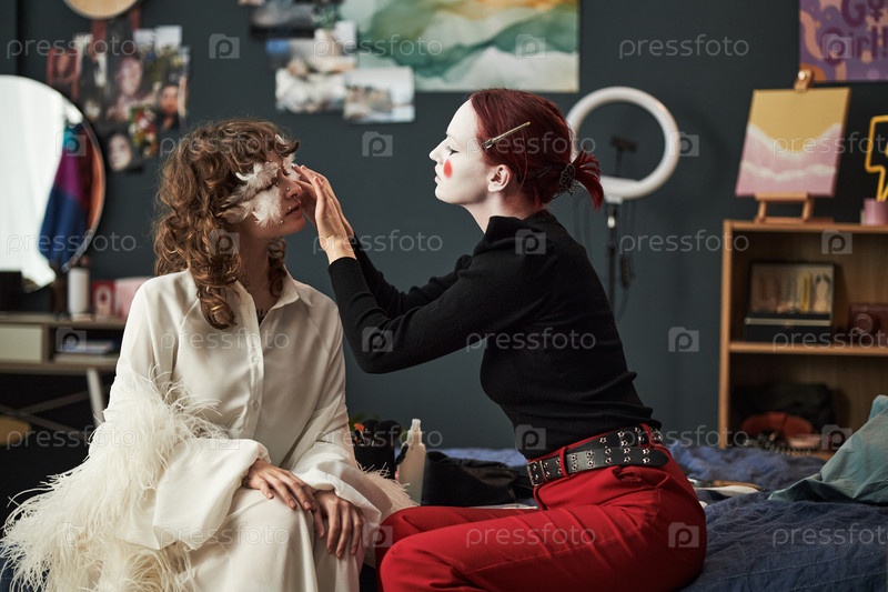 Девчонки Gen Z, создающие креативный макияж, выглядят в уютной обстановке спальни