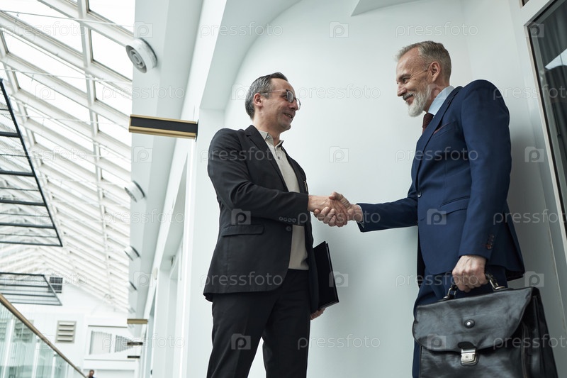 Бизнесмены пожали друг другу руки в современном офисном коридоре