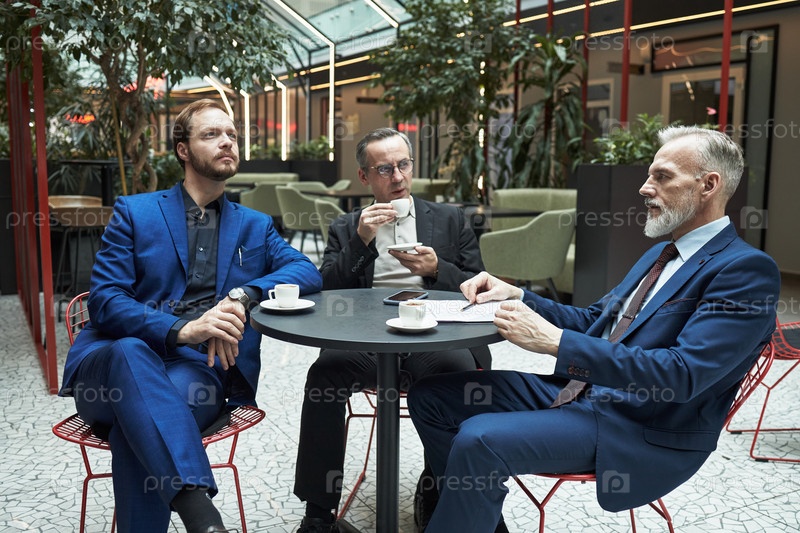 Бизнесмены обсуждают идеи за кофе в современном офисном кафе