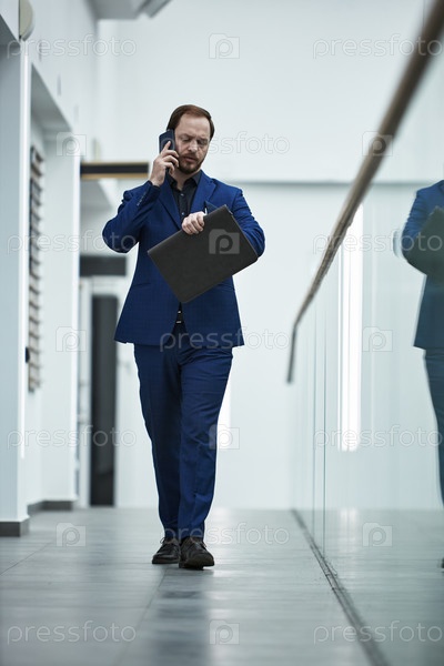 Бизнесмен ходит по коридору, разговаривая по телефону